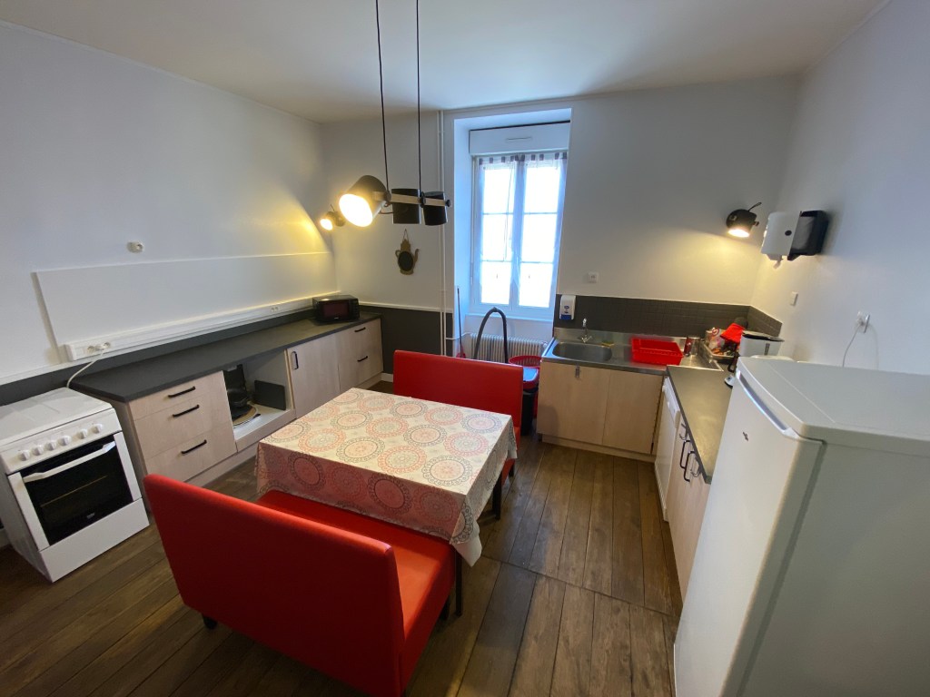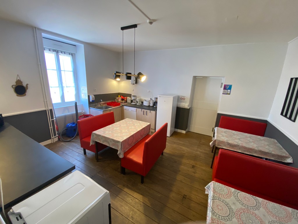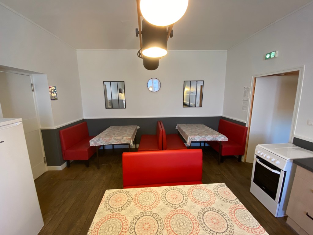 A l’étage, vous trouverez la cuisine si vous avez choisi la gestion libre ainsi qu’une salle commune pour prendre vos repas.