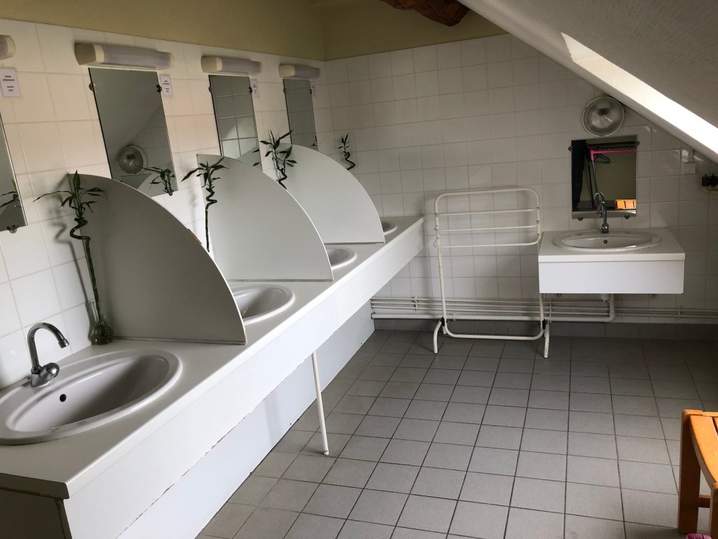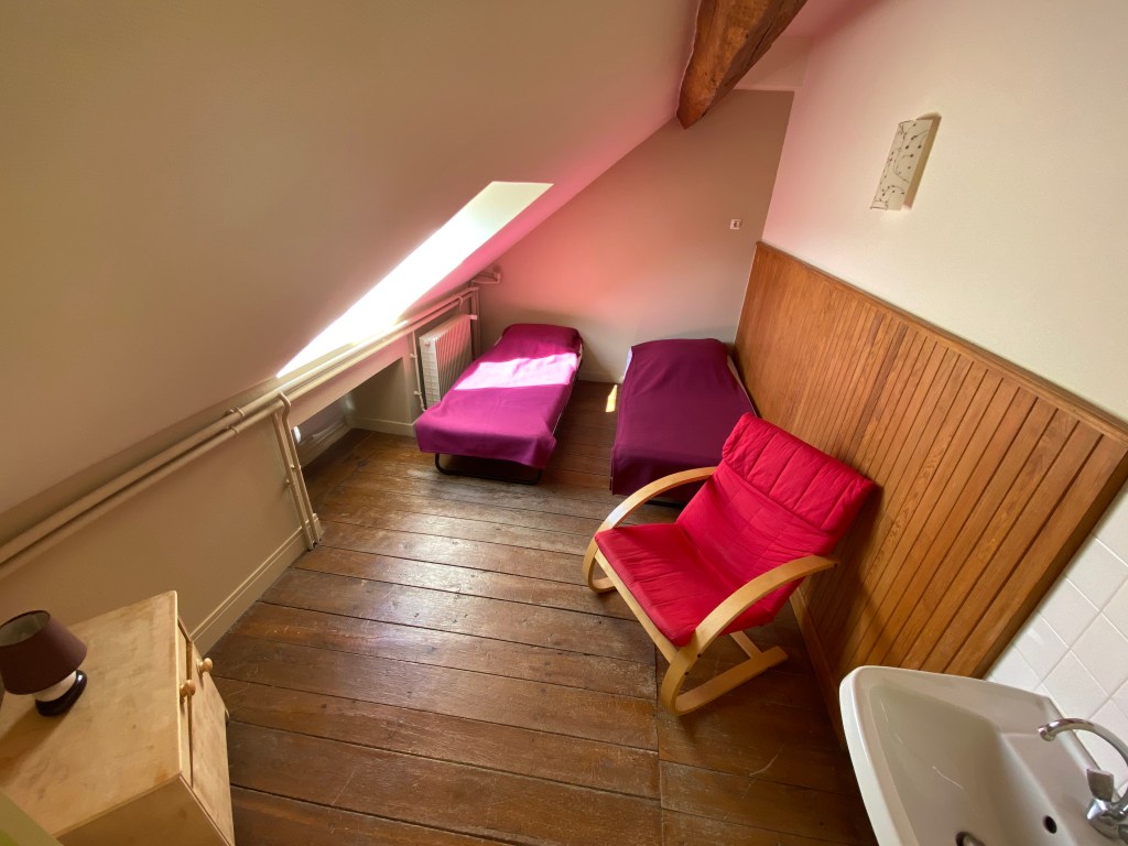 Toujours à l’étage se trouvent 2 dortoirs communicants de 16 personnes chacun avec lits superposés et lits simples, 1 petite chambre avec 2 lits simples (possibilité d’ajout d’un troisième lit) et un espace toilette avec 5 douches, 5 lavabos, 2 wc.